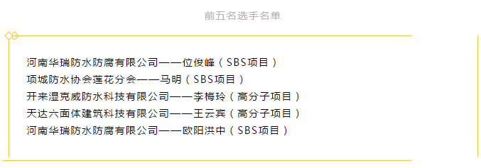 經(jīng)過一天的激烈爭(zhēng)鋒,最后河南建筑防水協(xié)會(huì)會(huì)長(zhǎng)陳寶貴發(fā)表講話并宣讀競(jìng)賽結(jié)果:高分子項(xiàng)目第一名則是來自開來濕克威防水科技有限公司的李梅玲,吳志強(qiáng)榮獲高分子第三名的好成績(jī),可喜可賀!期待他們?cè)谌珖?guó)復(fù)賽中再次爭(zhēng)鋒,再創(chuàng)佳績(jī)!