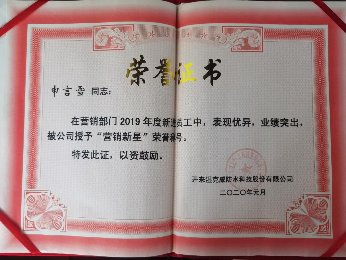 經(jīng)過(guò)三個(gè)月的努力,申經(jīng)理實(shí)現(xiàn)了從0到1的突破,在年底先進(jìn)評(píng)選時(shí)通過(guò)大家一致的認(rèn)可,獲得了2019年度營(yíng)銷新星的榮譽(yù)。