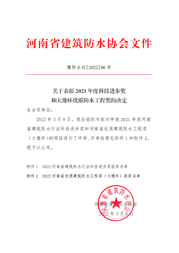 經河南省建筑防水協會專家評審,于2022 年 3 月 8 日又獲得2021 年度河南省建筑防水行業科技進步獎和河南省優質建筑防水工程獎(大豫杯)的稱號。