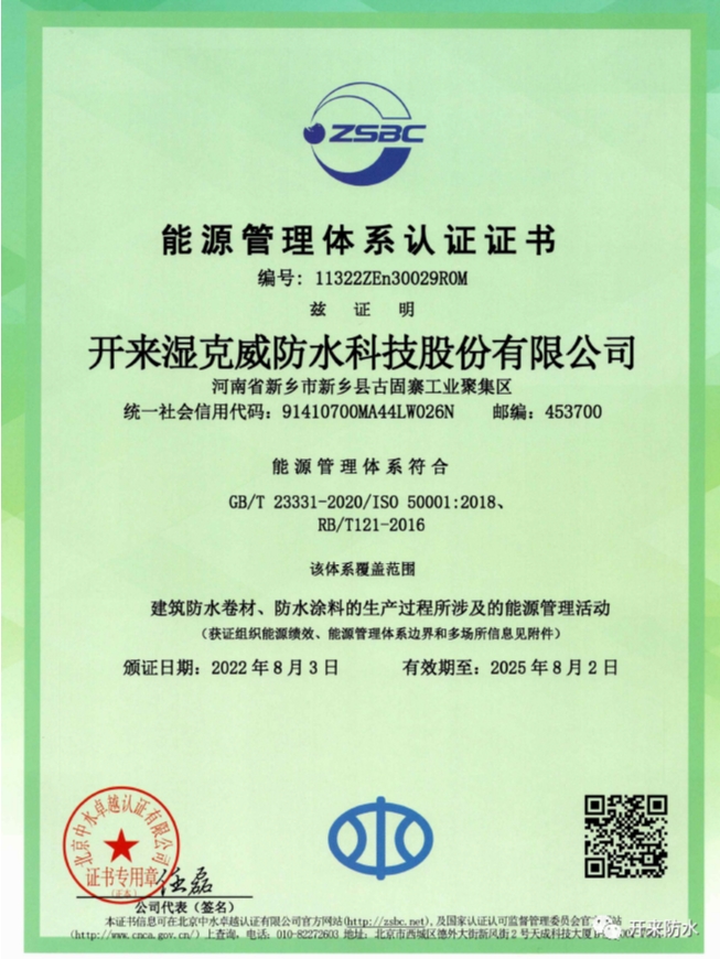 公司通過近一年的積極籌備,在低碳節能方面,通過多種途徑,降低能耗,發展綠色產品之路,實現供銷存財的協同發展。經過北京中水卓越認證有限公司的審核,于2022年8月3日獲得《能源管理體系認證證書》。該證書的獲得,是繼知識產權管理體系、兩化融合管理體系認證之后,又一個標志性的認證,標志著開來濕克威防水科技股份有限公司向綠色低碳發展的方向上又進了一步。