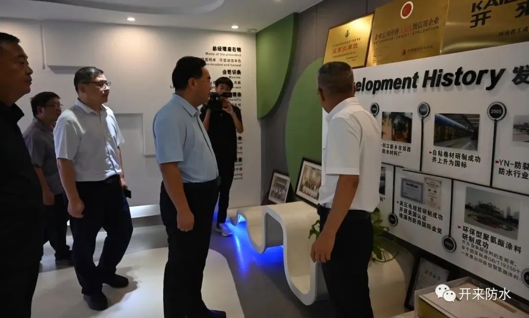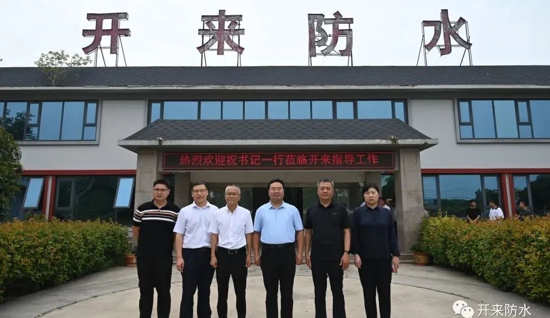 8月8日上午,新鄉縣委書記祝顯成帶隊到開來濕克威防水調研,縣委辦主任、開發區管委會主任王明輝,科工局局長王帥、農業農村局局長張罡、古固寨鎮黨委書記王宗源、鎮長張莉等一行陪同。