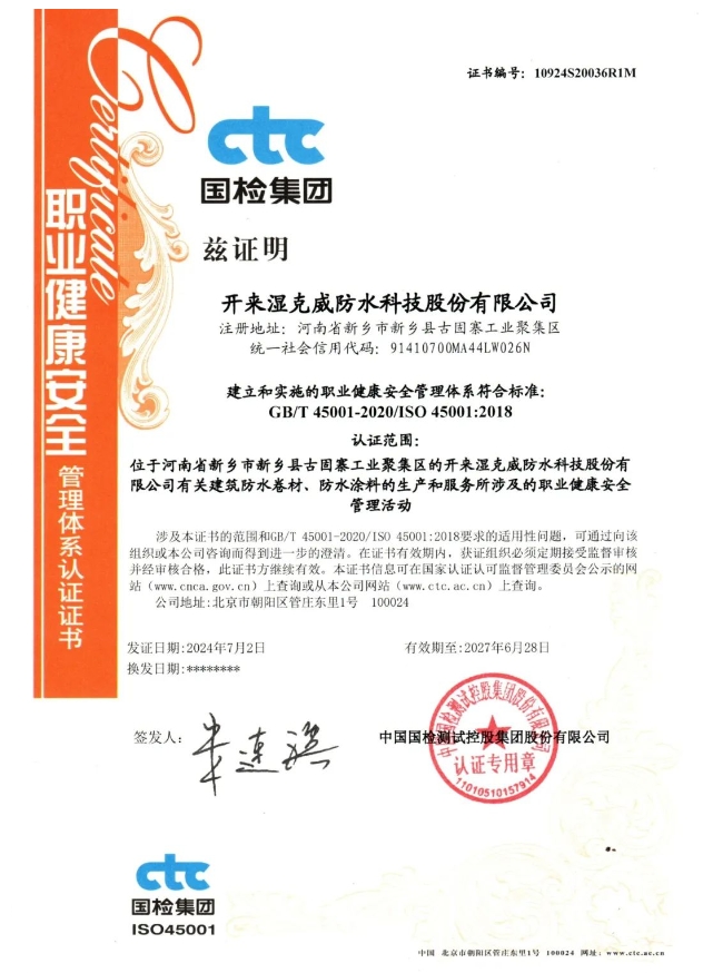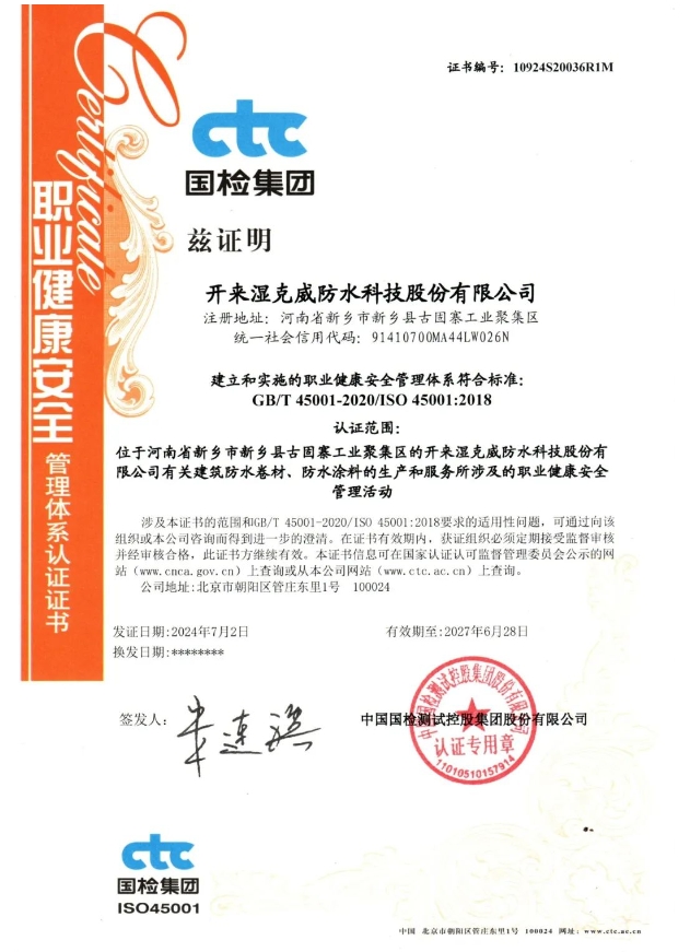 開來濕克威防水科技股份有限公司自2002年開始貫標(biāo)質(zhì)量環(huán)境管理體系以來,曾先后通過了質(zhì)量、環(huán)境、職業(yè)健康安全、CTC、知識(shí)產(chǎn)權(quán)、兩化融合、能源、綠色產(chǎn)品等多個(gè)管理體系的認(rèn)證審核。近日,公司的質(zhì)量、環(huán)境、職業(yè)健康安全再次通過國(guó)檢集團(tuán)的審核,獲得認(rèn)證證書。