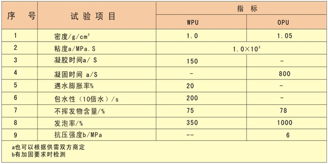 產品為單組分。是水溶性聚氨酯堵漏劑母液使用時加入30-40%。無水丙酮。使用效果與水溶性聚氨酯相同,由于材料中不含溶劑不易燃燒,便于安全運輸和保管。